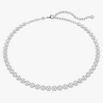 Confectionné avec un plaquage rhodié éclatant, ce collier met en valeur un rang de cristaux ronds étincelants. Chaque pierre est méticuleusement sertie dans un chaton bombé unique, qui amplifie la lumière et confère au bijou une texture douce et volumineuse.