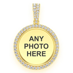 Réalisé en or jaune massif 14 carats, ce pendentif raffiné est sublimé par un entourage de diamants scintillants, pour un poids total de 0,50 carat, délicatement sertis autour du cadre et prolongés jusque sur la bélière. Leur éclat met magnifiquement en valeur la photographie, créant un contraste lumineux avec l’or poli miroir.